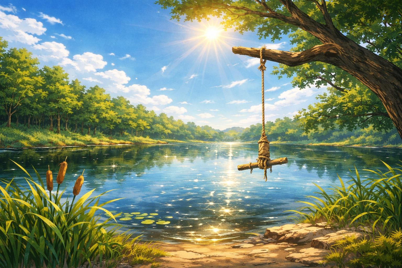 Ребята смеялись, наблюдая, как Арсений то и дело выныривал из сверкающего озера и, быстро вцепившись в верёвку, старался разбежаться посильнее. И снова — визги, брызги и солнце, которое после воды грело особенно приятно.